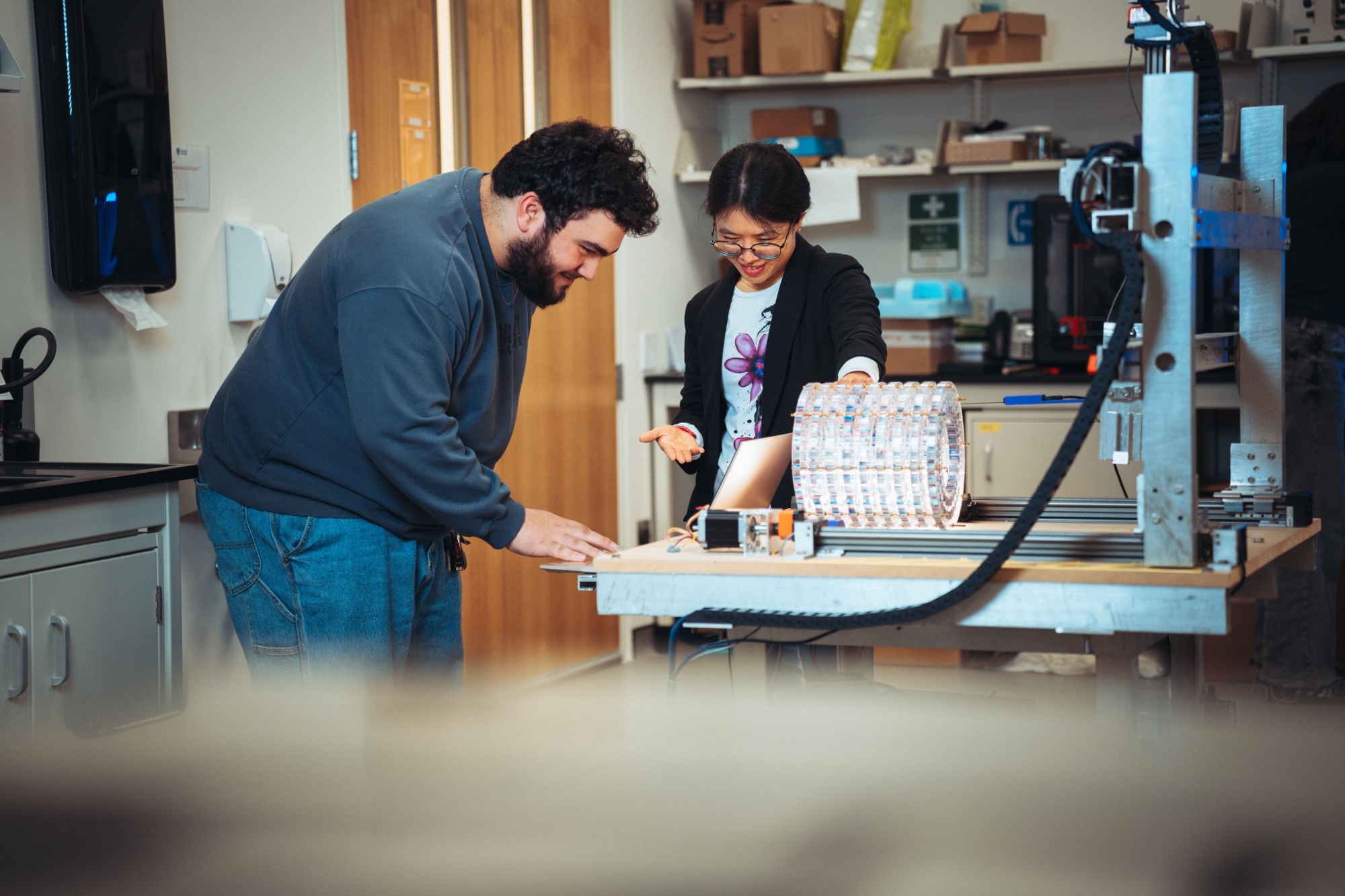 Dan Xiao, a professor in the Department of Physics, working with a student in a University of Windsor lab.