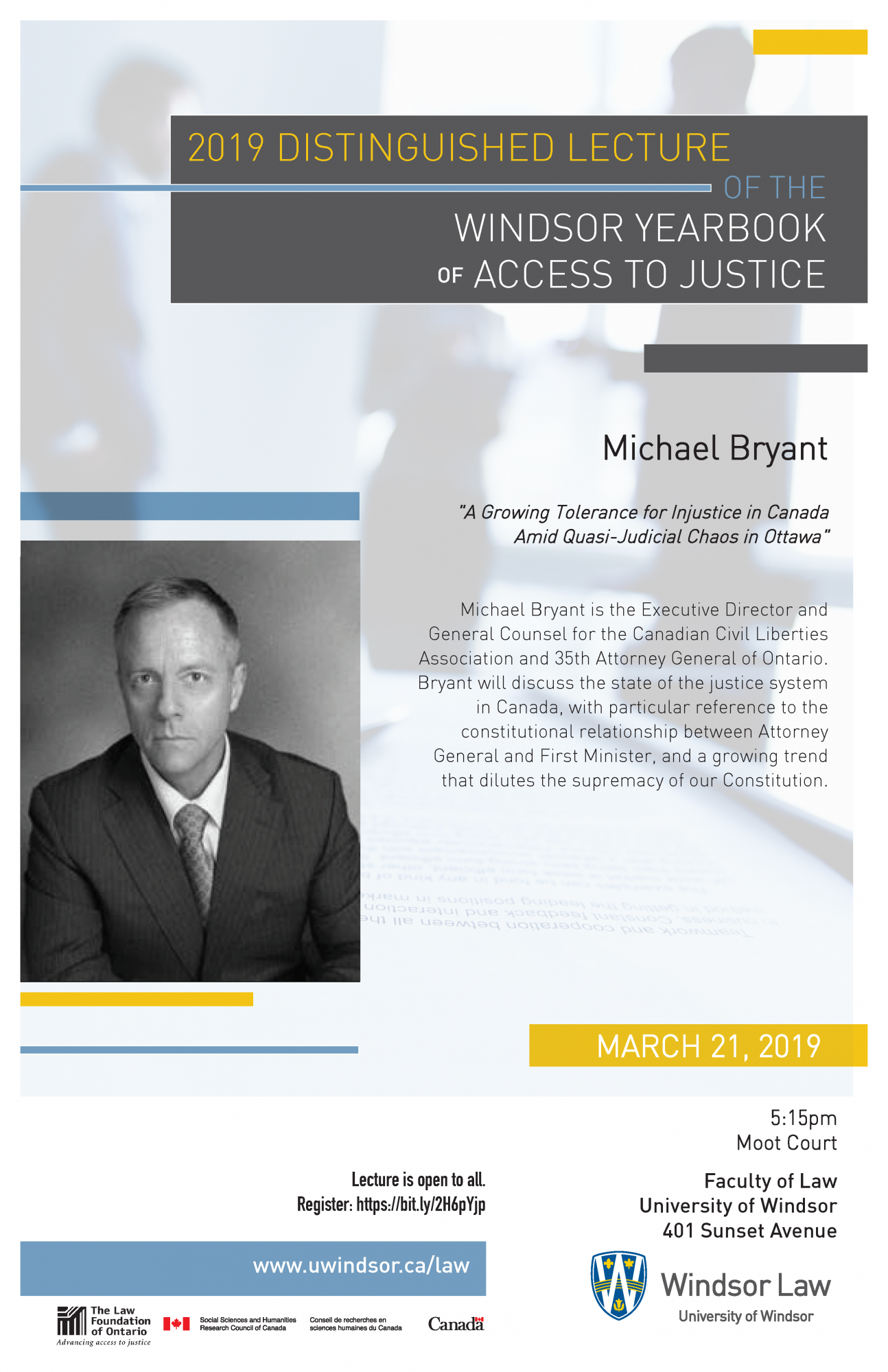 The Windsor Yearbook of Access to Justice is pleased to present Michael Bryant, Executive-Director of the Canadian Civil Liberties Association and former Attorney-General of Ontario for his talk: "A Growing Tolerance for Injustice in Canada Amid Quasi-Judicial Chaos in Ottawa.”