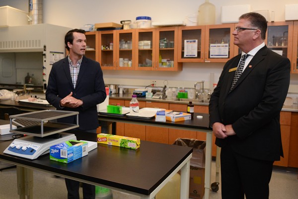 Kinesiology professor Matthew Krause shows his research facilities to Jonathon Dent of donor CIBC.