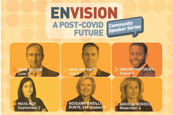 “Envision a Post-COVID Future” will feature guest speakers with expertise in areas such as business, social justice, innovation, policy, and technology. Attendees will have the opportunity to ask questions following the presentations.