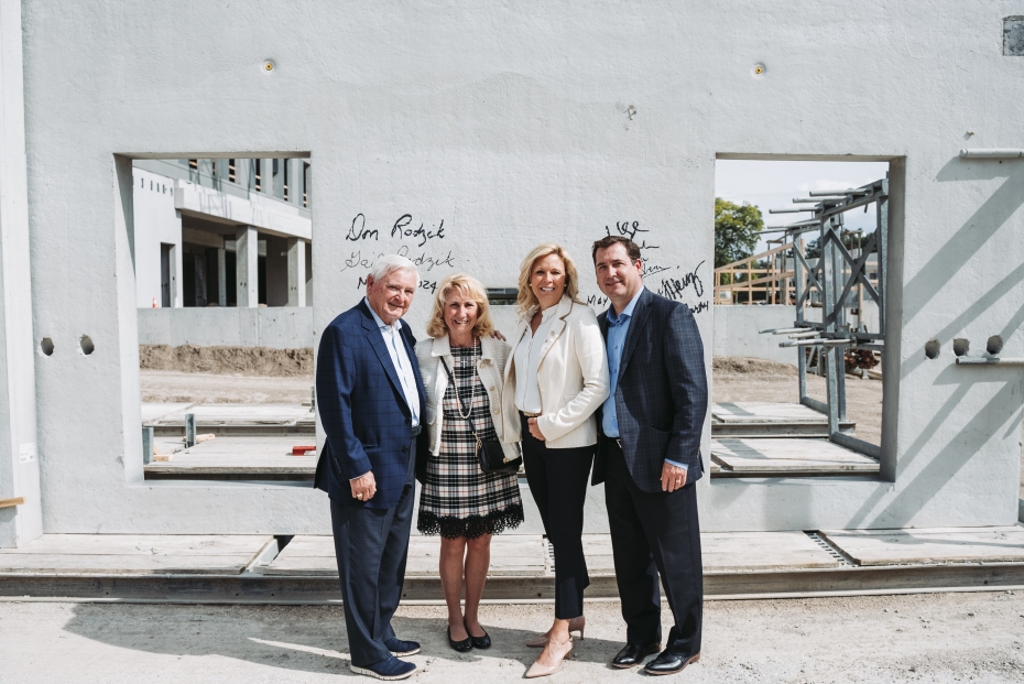 Don Sr., Gail, Amber and Don Jr. Rodzik pose in front of a signed section of the residence wall on Tuesday, May 28, 2024. This panel will be installed in the new six-storey Rodzik Hall. (Photo by the University of Windsor)