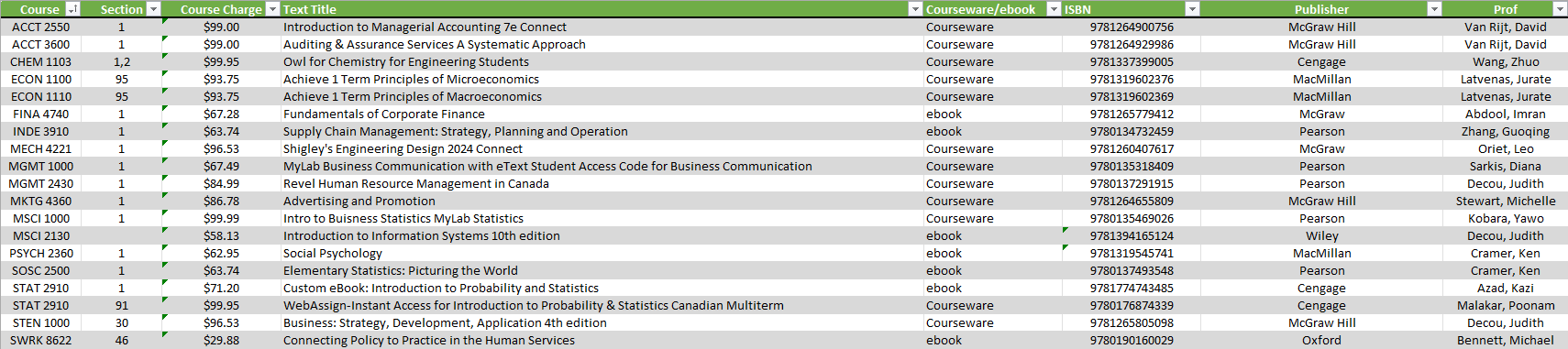 The UWIN Textbook Pass program will allow students to access the required course materials through Brightspace and be charged on their tuition account. Students can opt out of the program but we highly recommend reviewing your course syllabus to understand whether the textbook is needed for the course before opting out. Please see below for participating courses and each material cost.