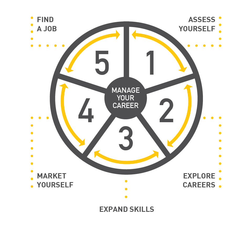 Our career planning guide outlines the steps in this process. Remember, this fluid, dynamic and continuous process is part of a lifelong journey and as you come to new decision points, you may return to an earlier stage in the cycle. It is also possible to be moving through multiple cycles simultaneously, like looking for a summer job while planning for your long-term career.