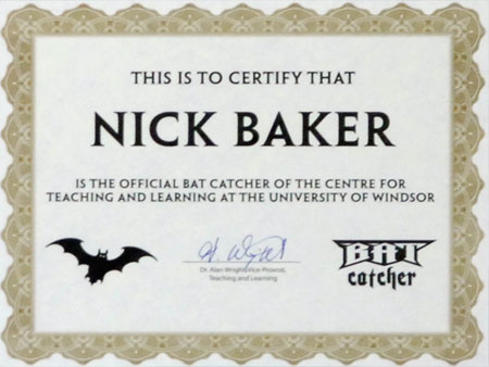 A close up of the Bat Catcher certificate. Nick has promised to fly in from Australia should another animal infiltrate the CTL again.