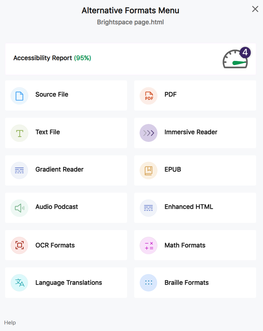 Instructors and students can access Panorama tools in their Brightspace courses and select to view a document in an Alternative Format or view an Accessibility Report.