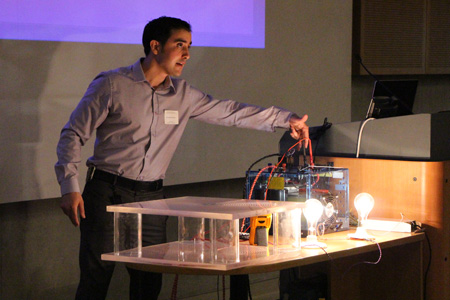 Graduate student Bryan Estaban demonstrates a wireless power transfer system that harnesses electricity from a magnetic field. He believes it could be incorporated into electric vehicles, eliminating the need to plug them in.