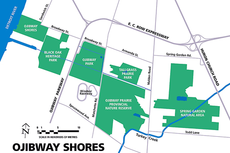 Ojibway Shores links the Ojibway Complex of parks and natural areas to the Detroit River. (Click on map to enlarge.)
