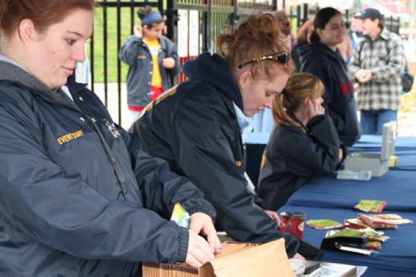 Lancer home events staff prepare materials outside the south campus stadium before a football game.