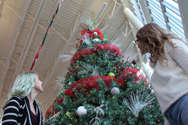 Students Erika Koehn and Victoria Mahon take the full measure of the eight-metre tall Christmas tree in the CAW Student Centre on Thursday.