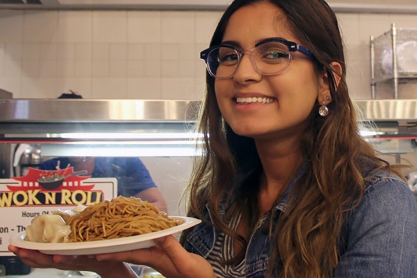 Law and politics major Katrina Bahnam grabs lunch from the Wok N Roll outlet in the Marketplace food court.