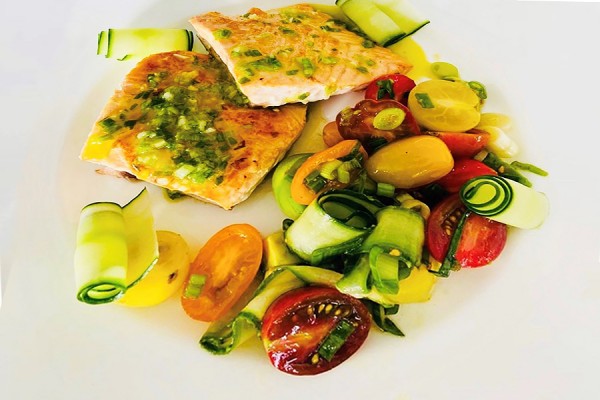 Pair grilled salmon with a salad of tomato, green onion, and cucumber to make refreshing summer meal.
