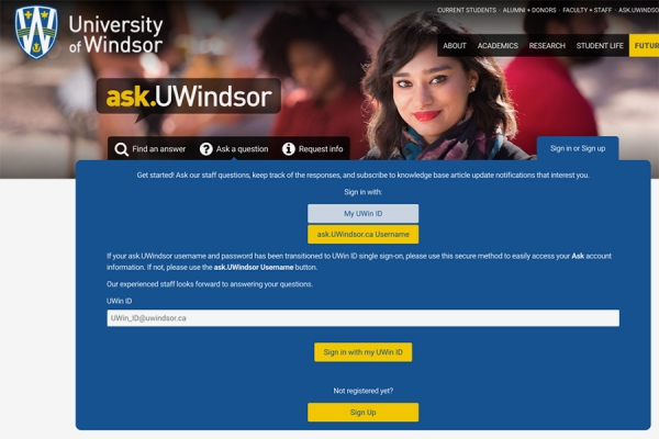 Ask.UWindsor.ca is an online repository of knowledge base articles for applicants and current students that can be accessed at any time. It offers hundreds of articles ranging from registration information, how to access UWinsite Student, to applying to graduate. If someone has a question that does not have an answer, they can post the question for a UWindsor staff member to answer.