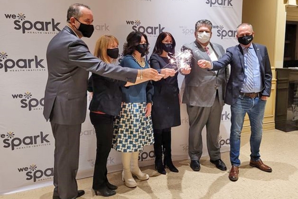 Striking sparks: celebrating a new partner joining the WE-Spark Health Institute are officials (from left) Bill Marra of Hôtel-Dieu Grace Healthcare, Lisa Porter of WE-Spark Health Institute, Patti France of St. Clair College, Kristin Kennedy of Erie Shores HealthCare, David Musyj of Windsor Regional Hospital, and Chris Houser of the University of Windsor.