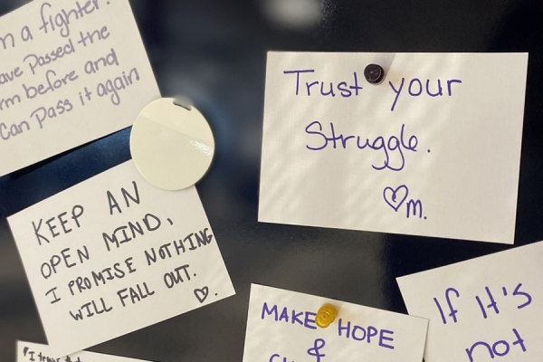 The office, located on the second floor of the Joyce Entrepreneurship Centre, invites visitors to “make one or take one” — either write an affirming message to share, or take one that resonates with an individual.