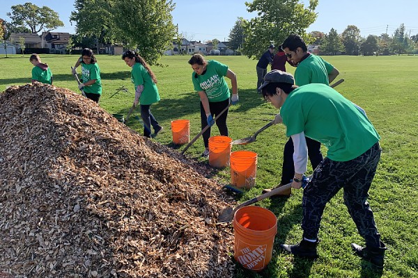 Students shovel mulch to place around newly-planted trees in Gignac Park.