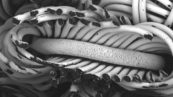 This image by Gloria D’Amaral, a PhD candidate and graduate research assistant to chemistry professor Tricia Carmichael, is a finalist in the national Science Exposed contest. It shows a cross-section of spandex and nylon fibres in pantyhose, suitable as a foundation for development of wearable electronic materials.