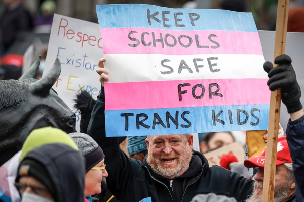 Hundreds of people attend a rally to protect trans kids in Calgary in February 2024.