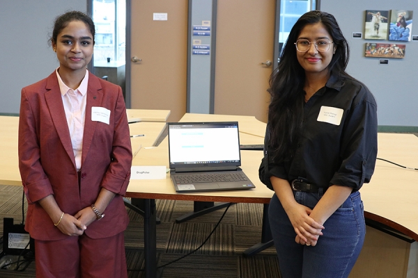 Lead organizers Abbie Dewhirst (left) and Vivian Tang (right) congratulate members of the top-finishing team at WinHacks 2024, HackyMcHackFace, who shared a $400 prize.