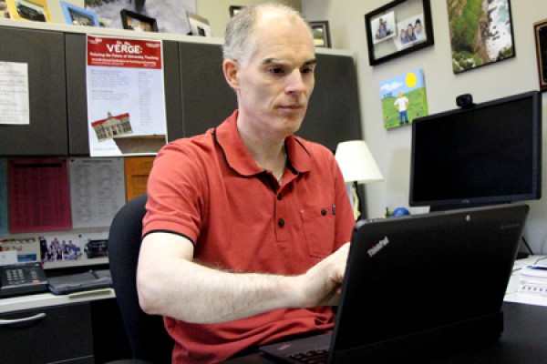 Human kinetics professor Dave Andrews works on a laptop in his office. The ergonomics researcher is recruiting participants for a study to determine whether the way people interact with their mobile devices may be hurting them.