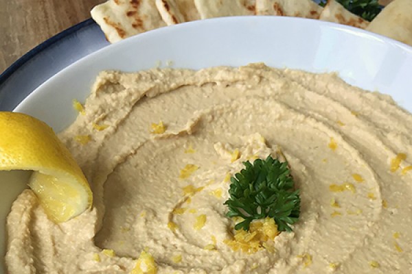 Hummus dip with pita is a new addition to the menu of the Mediterranean Grill station in the Market Place.