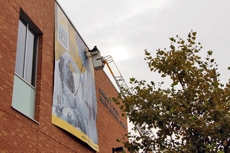 Workers install a banner celebrating the University’s 50th anniversary outside the Toldo Health Education Centre. The large-scale signs, bearing images drawn from 50 years of history, are appearing on buildings across campus.