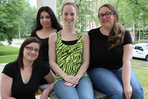 UWindsor student Jane McArthur with the other winners of the Storytellers contest: Miriam Miller, Enrico Quilico, Siqi Xiao, and Joshua Steckley.
