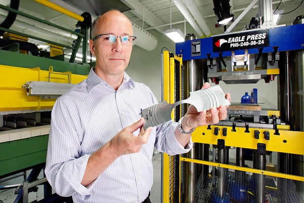 Professor Daniel Green displays a sheet metal specimen in the Mechanical Testing Lab at the Ed Lumley Centre for Engineering Innovation. The specimen was stretch-formed in a formability test.