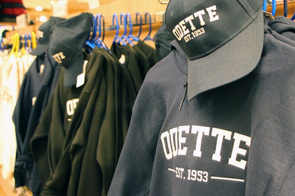 A stadium fleece hoodie for sale in the Campus Bookstore combines a Lancer shield and Nike swoosh to send the message: “Just do it.”