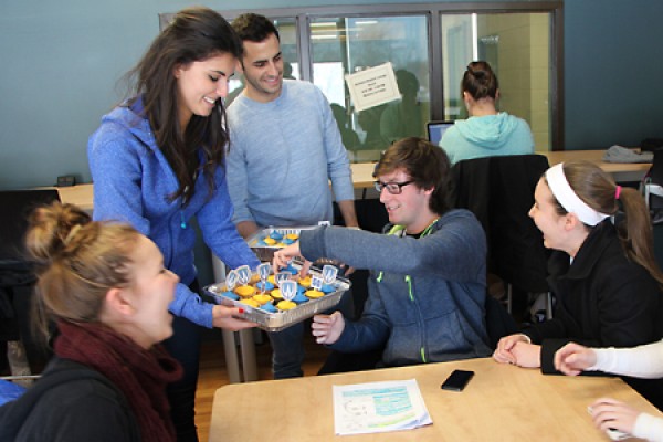 UWSA officials Ivona Bilbilovska and Josh Paglione hand out cupcakes to happy students (seated from left) Hannah Butcher, Cody Fields and Mikayla Roberts, in the science student lounge Monday.