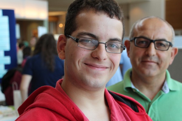 George Mitri, an incoming student of engineering, celebrates winning a $500 tuition voucher in a draw during Head Start with his father George Mitri.