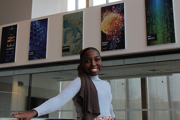 Student Alaa Eissa poses beneath the new banners hanging in the atrium of the Essex CORe.