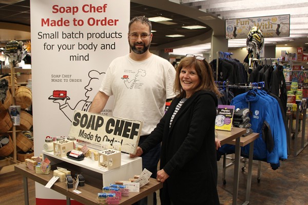Andrew Braithwaite celebrates the stock of his Soap Chef products in the Campus Bookstore with general merchandise buyer Jackie Imeson.