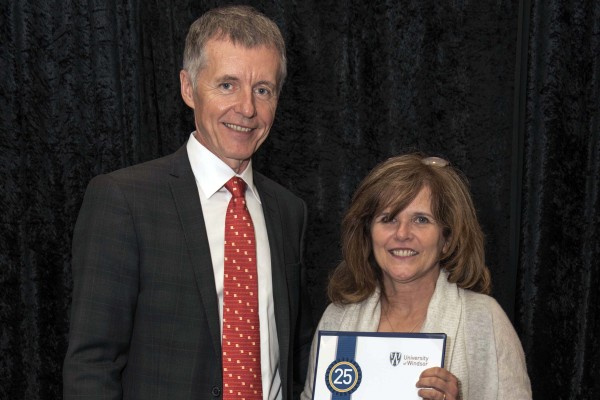 Jackie Imeson, who reached 25 years of service in 2015, accepted congratulations from UWindsor president Alan Wildeman during a luncheon on June 12.