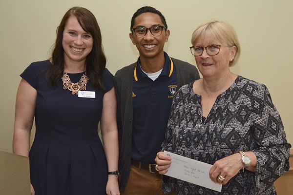 Shae Harasym congratulates clerk Miguel Pebenito and retiree Janice Facecchia, volunteer canvassers in the finance and human resources departments.