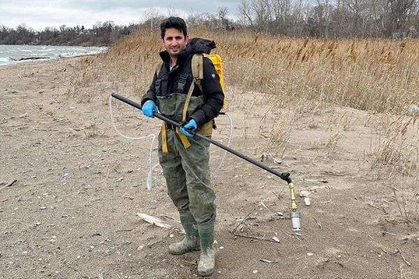 Javad Sadeghi uses a backpack sample collector to gather water off a Lake Erie beach to filter for micro-organisms.