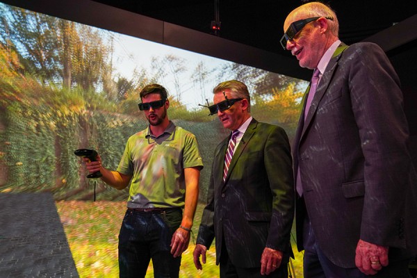 Ryan Gilleran, an application engineer with ANSYS, demonstrates a virtual reality cave to UWindsor provost Douglas Kneale and associate vice-president academic Jeff Berryman at a $5 million funding announcement for automotive innovation in Windsor-Essex.