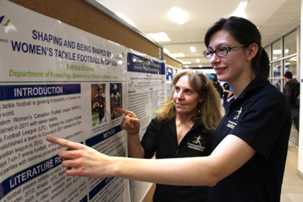 A graduate student in the university’s kinesiology department, she’s studying the differences between two Canadian women’s tackle football leagues – one which requires its players to wear full uniforms, the other in which they play in bikinis.