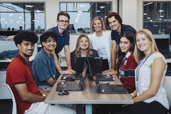 Krista Ammonite, quality planning manager at NextStar Energy (fifth from left), meets with engineering students Sulayman Syed, Nicholas Nguyen Pham, Michael Schembri, Alessia Favrin, Drew Booker, Hanna Rashidzadeh, and Lauren Schmidt at the company’s battery manufacturing plant in east Windsor.
