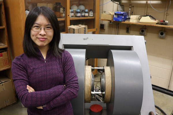 Physics professor Dan Xiao is experimenting with an electromagnet to develop a portable Magnetic Resonance device.