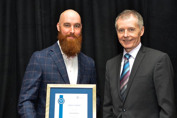 Gardener Aaron Dickau accepts congratulations on his Impact Award from UWindsor president Alan Wildeman at the Employee Recognition Awards reception Wednesday.