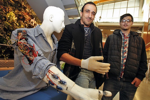 Engineering students Mohammad Kaddouh and Mohanad Elkafarneh demonstrate the robotic arm they designed and built.