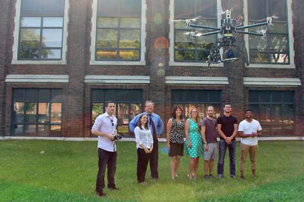 Kyle Archibald demonstrates the use of a flying drone for student recruiters Neda Demiri, Dave Bussiere and Zora Savic and digital media production students Naomi Pelkey, Doug Cunningham, Milos Savic and Cherry Theresanathan.