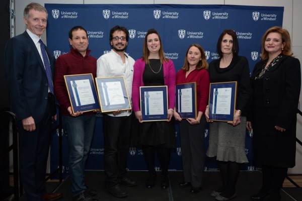 UWindsor president Alan Wildeman congratulates Russell Nahdee on his “U” Make a Difference Award.