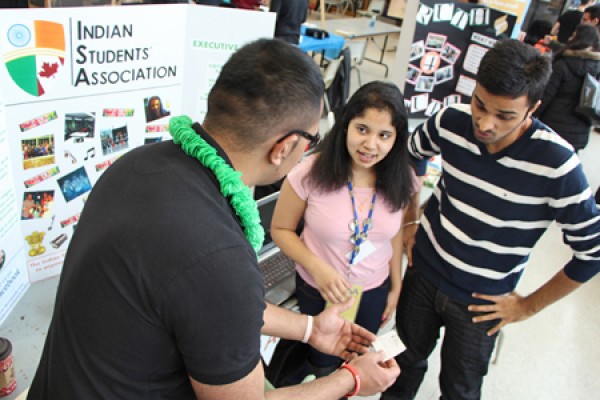 Shauhrat Gill, Vidya Mohan and Shivender Shivender discuss the benefits of membership in the Indian Students’ Association, during Club Day activities Thursday in the CAW Student Centre.