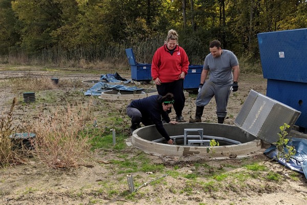 Watershed research technicians Mackenzie Porter and Samantha Dundas of the Essex Region Conservation Authority and biochemistry student Dave Ure clear a biofilter at the Lebo Creek Wetland.