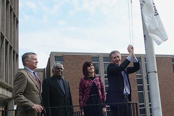 Provost Douglas Kneale, campaign co-chair Datta Pillay and United Way CEO Lorraine Goddard watch as UWindsor president Alan Wildeman raises the charity’s flag.