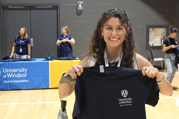Petra Monaco, an Italian exchange student in civil engineering, shows off the T-shirt she received from the alumni association at the start of the Welcoming Celebration, Wednesday in the Toldo Lancer Centre.