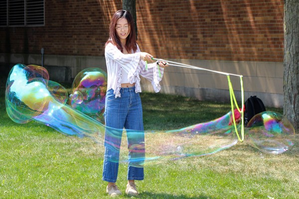 Master’s student of applied economics Wenyue Zhang makes a monster bubble during World Student Day activities, Friday in the David A. Wilson Commons.
