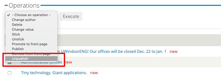 To unpublish a page, find the page in your Content list and check the box next to the page title: