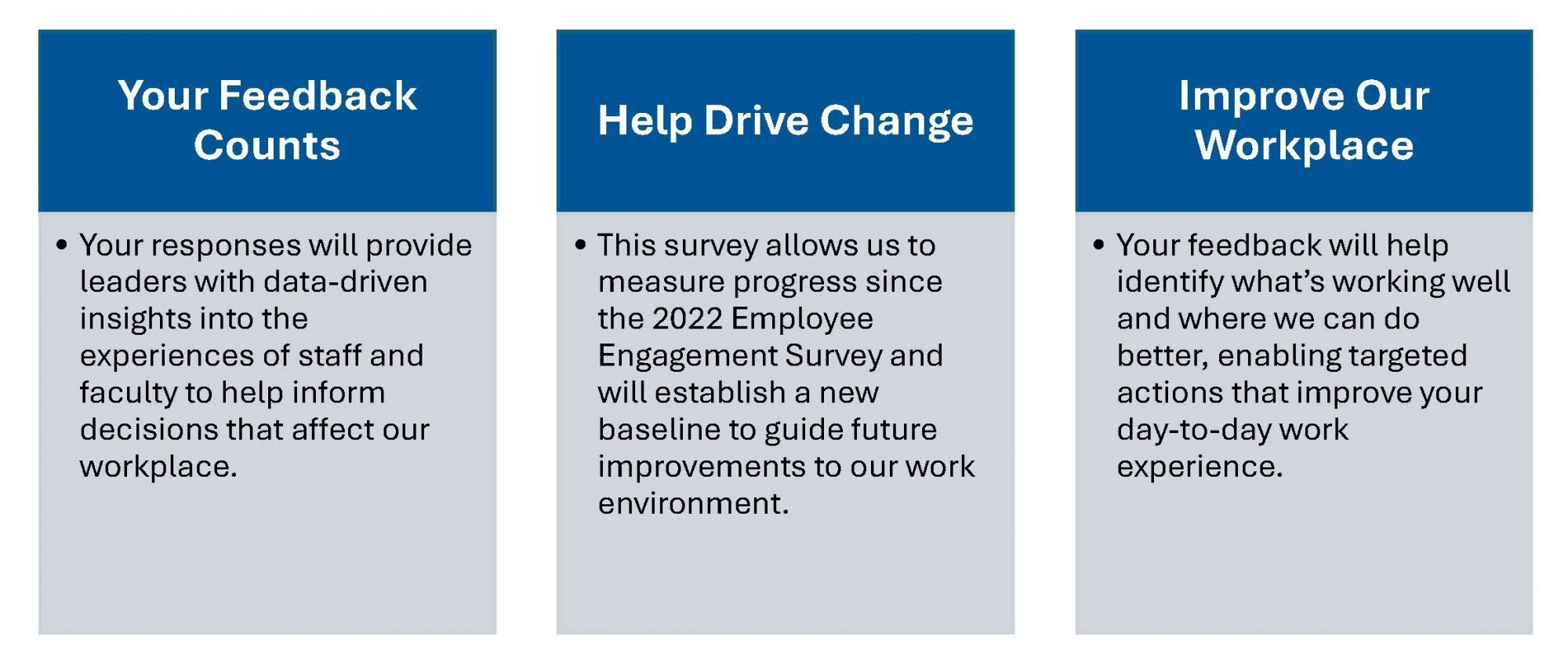 This is the University’s second Employee Engagement Survey, which allows us to directly measure our progress against the 2022 results. After four years of significant change, your input is crucial to help us accurately take stock of our work environment and determine the most critical areas for improvement moving forward.